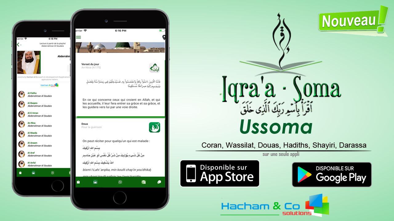 Reconnue par tous les comoriens, Ussoma propose l’intégralité du Coran avec récitations audio (+ de 20 récitateurs), Wassilatu Chaafi, des Douas, des Hadiths, une rubrique Spécial ramadan avec des hadiths, des dous, des kassudas, ma chayiri comoriens, darassa la dine …etc.